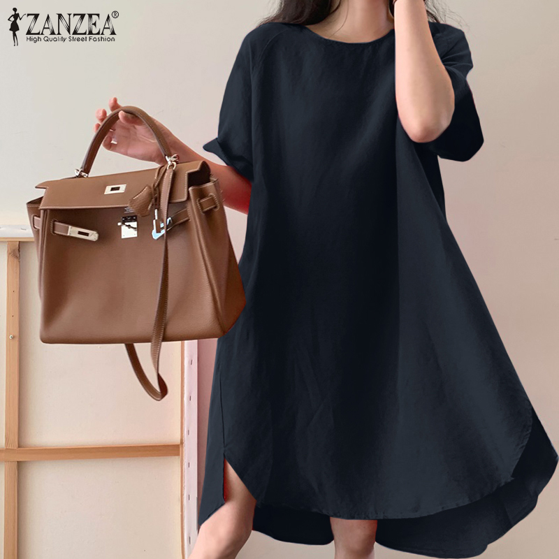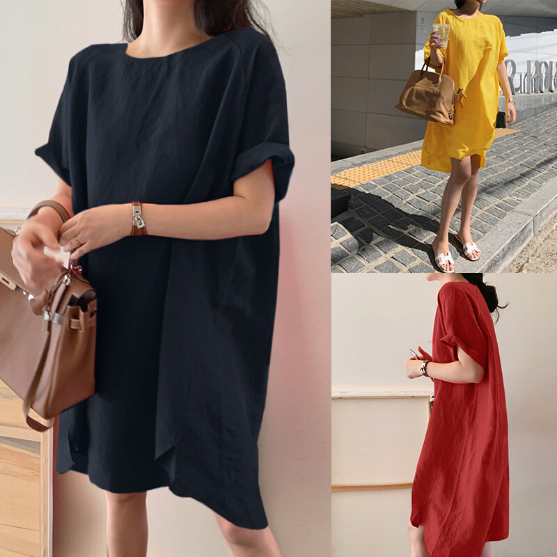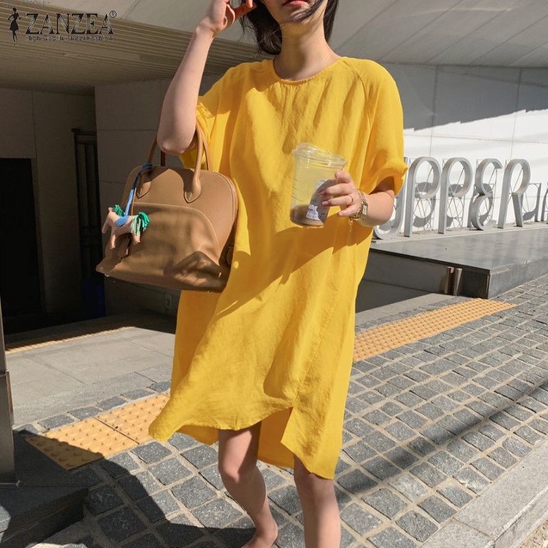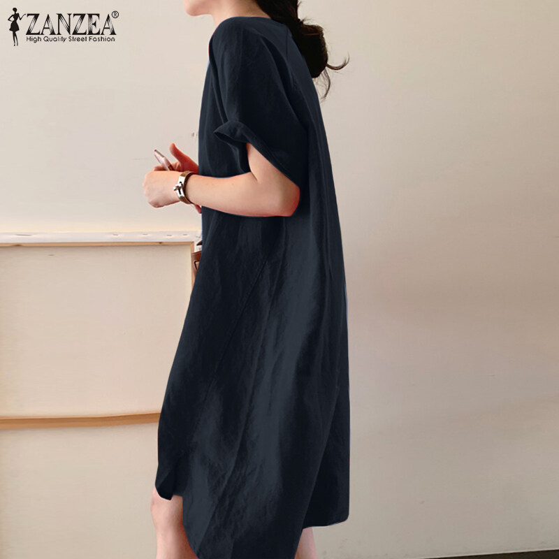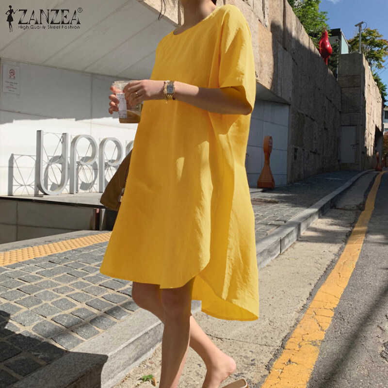 ZANZEA Korean Style Women Short Sleeve O-Neck Linen Cotton Plain Mini T-Shirt Dress