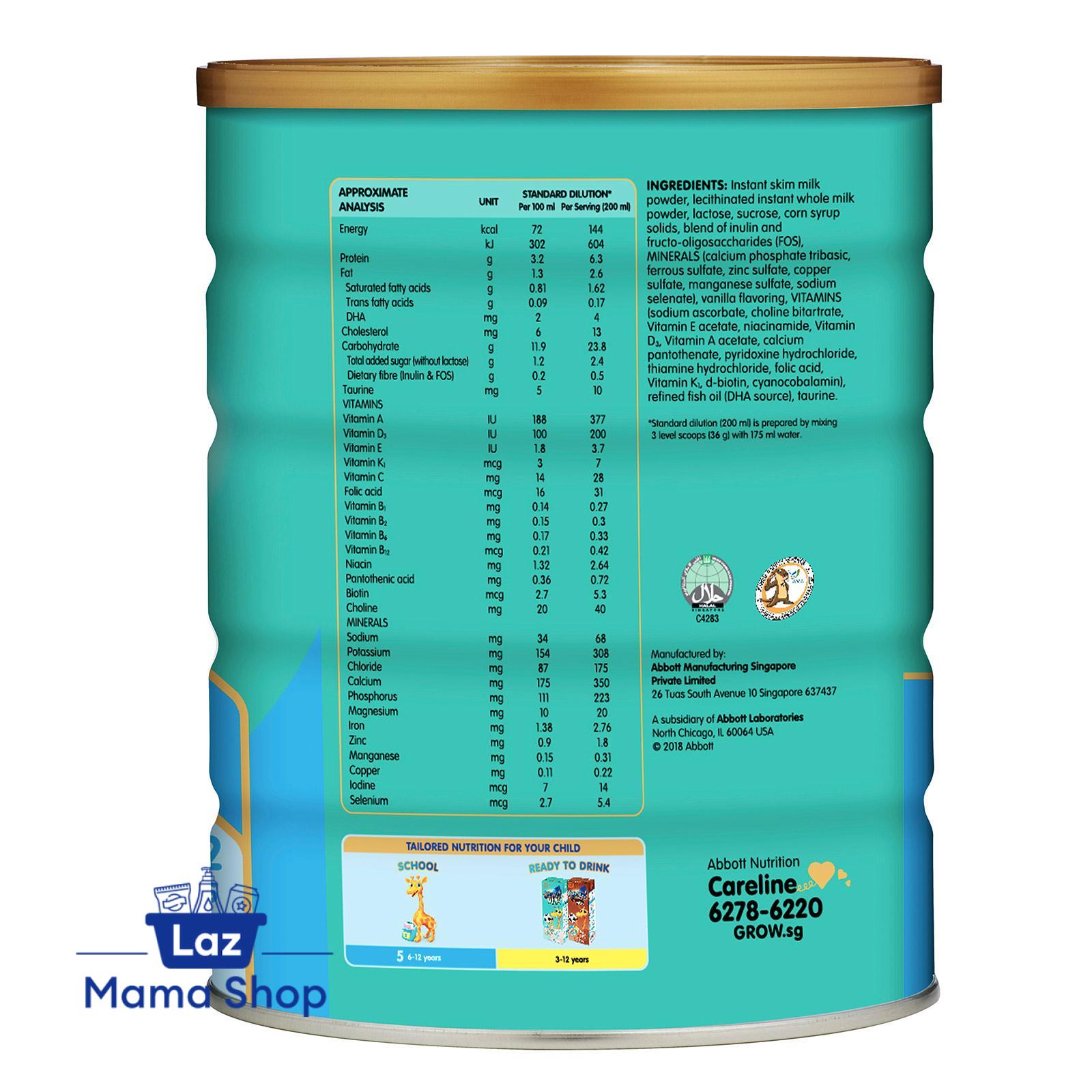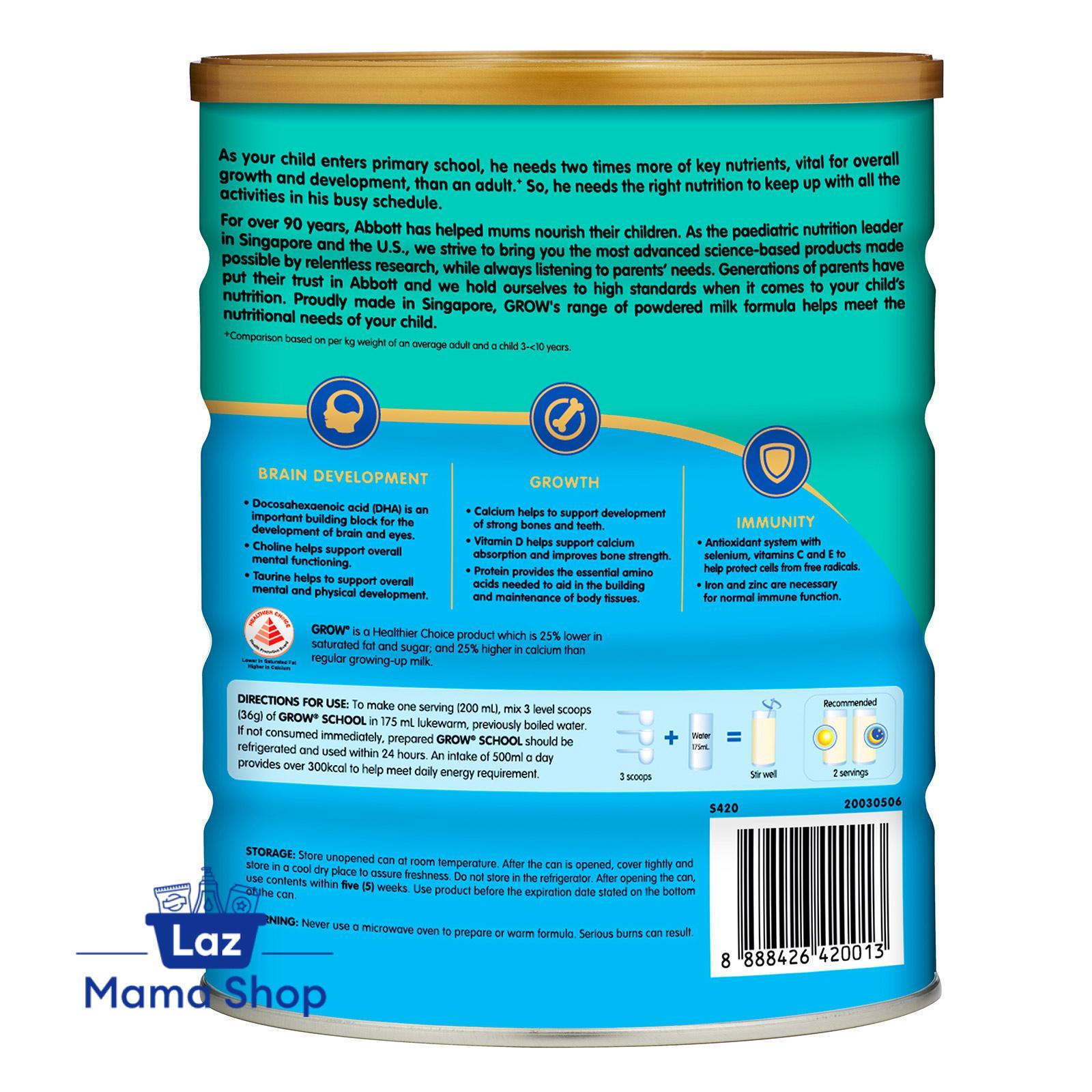Abbott GROW milk powder for school-going children is formulated to provide essential nutrients to support their overall growth and development. GROW School is scientifically formulated to support the nutritional needs of your child in their formative years. Brain Development: DHA is an important building block for the development of brain and eyes. Growth: Calcium helps to support development of strong bones and teeth. Vitamin D helps support Calcium absorption and improves bone strength. Immunity: Antioxidant system with Zinc, Vitamins C and E to help protect cells from free radicals. Iron and Zinc are necessary for normal immune function. Unique vegetable fat blend with No Palm Oil. GROW is a Healthier Choice product which is lower in saturated fat and higher in calcium.