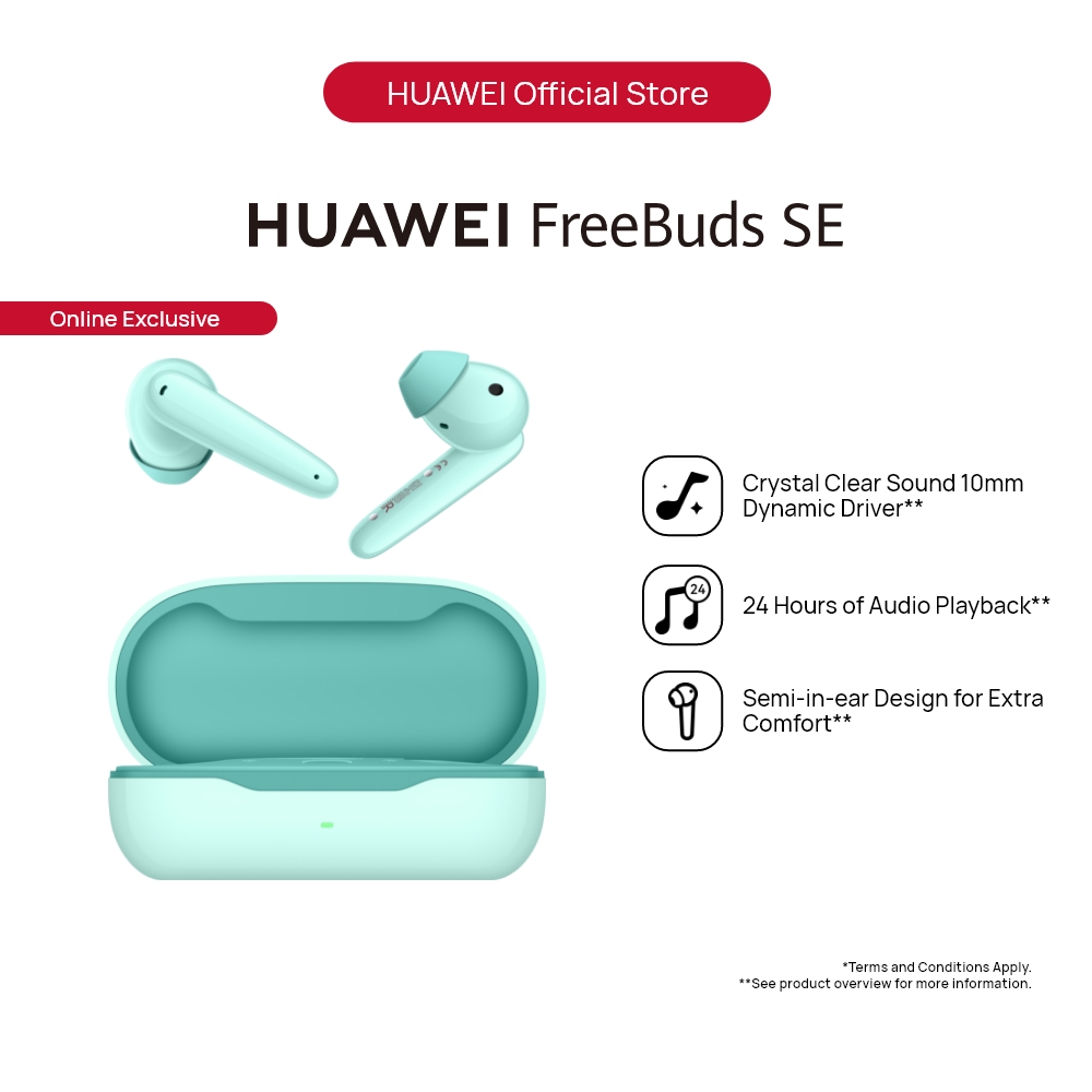 HUAWEI FreeBuds SE Wireless Semi-In-Ear Bluetooth Earbuds. Semi in-ear design has been crafted to fit the contours of the outer ear, providing comfortable wearing. Vivid color scheme interprets premium design. Crystal clear sound quality and long-lasting power making it the perfect medium to appreciate all of your favorite music. In addition, with Call noise cancellation, Low-latency gaming, 3 ear tip sizes and natural tap controls, HUAWEI FreeBuds SE provides a high-quality music experience.