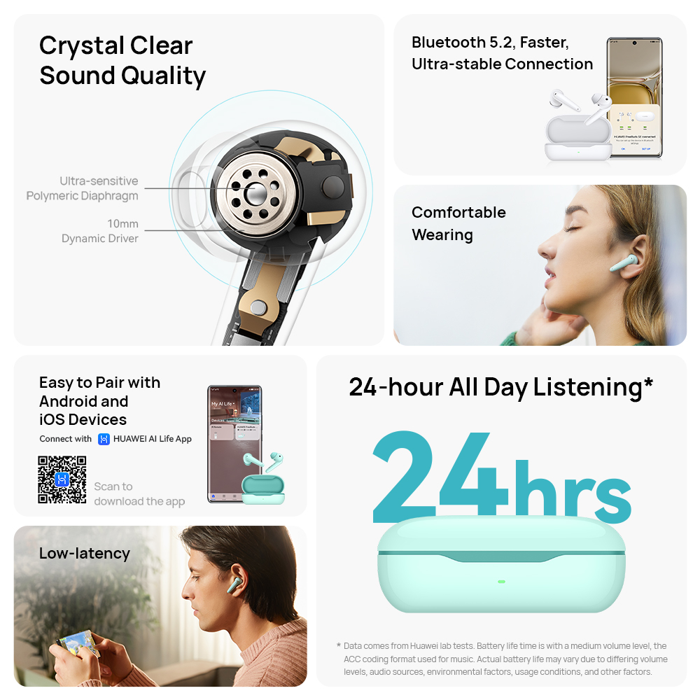 *Data comes from Huawei lab tests. Battery life time is with a medium volume level, the ACC coding format used for music. Actual battery life may vary due to differing volume levels, audio sources, environmental factors, usage conditions, and other factors.