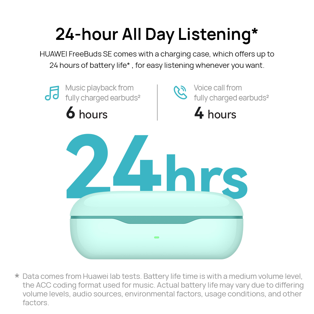 【24 Hours Long-lasting Power】HUAWEI FreeBuds SE wireless Bluetooth earbuds come with a charging case, which offers up to 24 hours of battery life, for easy listening whenever you want.