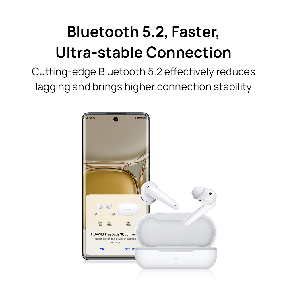 【Comfortable Wearing】HUAWEI FreeBuds SE's semi in-ear design has been crafted to fit the contours of the outer ear, and reduce pressure on the ear canal, providing a breathable, lightweight fit.